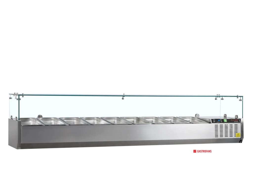 Model TEFCOLD GVC38-200 je výkonná a odolná chladiaca nadstavba pre gastronádoby GN 1/3. Je ideálnou voľbou pre pizzerie, fast foody a ďalšie prevádzky rýchleho občerstvenia, kde je kľúčová rýchlosť a organizácia. Umožňuje ľahký prístup k čerstvým surovinám, ktoré zostávajú dokonale chladené. Nadstavba pojme až 9 GN 1/3 nádob (nie sú súčasťou balenia) a udržuje teplotu pomocou statického chladenia. Konštrukcia z nerezovej ocele SS201 je odolná voči korózii a ľahko sa čistí. Sklenené veko zaisťuje hygienu a skvelý prehľad o uložených surovinách.