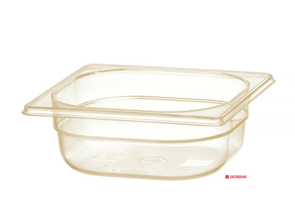 Vysokoteplotná grilamidová nádoba GN 1/6 je univerzálnym riešením na bezpečné skladovanie potravín. Je vyrobený zo svetlo žltého grilamidu s vysokou teplotnou odolnosťou (-40 °C až 150 °C), bez karcinogénneho bisfenolu A (BPA free). Nepohlcuje pachy ani chute. Nádoba na potraviny je vysoko odolná proti mechanickému poškodeniu. Na bočnej stene má stupnicu objemu. Nádoba pre gastronómiu je vhodná na použitie v akejkoľvek fáze spracovania potravín: mikrovlnné rúry, bemary, ohrievače, mrazničky, rýchlomrazničky a chladničky. Dóza na potraviny sa vďaka svojej stohovateľnosti pohodlne skladuje. Je možné ju umývať v umývačke riadu.Dodatočné parametre