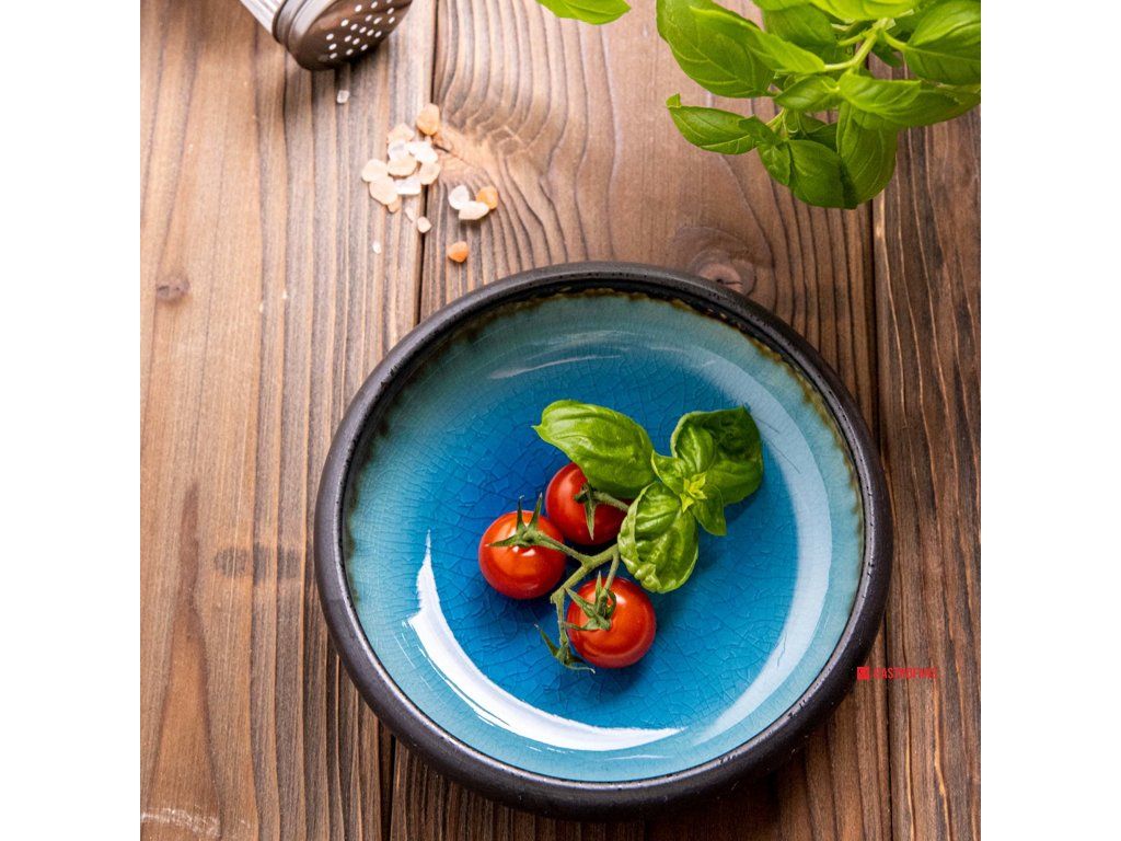 Kolekcia Lazur vyniká dominantnou modrou farbou a nepravidelnou štruktúrou povrchu, ktorá pôsobí prirodzene a autenticky. Jemne drsnejšia textúra dodáva riadu remeselný charakter a podčiarkuje vizuálny kontrast servírovaných pokrmov.