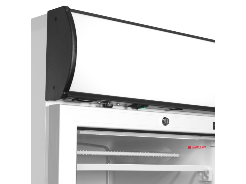 UFFS371GCP je profesionálna mraznička s presklenými dverami a svetelným panelom pre efektívnu propagáciu značky. Kombinuje vynikajúcu prezentáciu výrobkov s úspornou prevádzkou a tichým chodom – iba 40 dB(A). Vďaka vyhrievaným dverám nedochádza ku kondenzácii, LED osvetlenie zvýrazní vystavený tovar a statické chladenie s výparníkmi v policiach zabezpečí rovnomernú teplotu. Praktický odtok vody pri odmrazovaní uľahčuje údržbu, zatiaľ čo svetelný reklamný panel pomáha pritiahnuť zákazníkov.