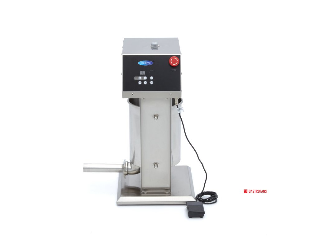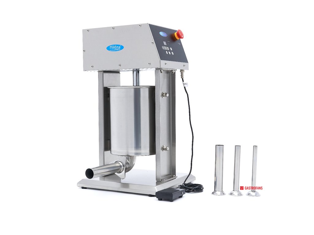 Naplňte klobásy rýchlo a efektívne pomocou tejto automatickej plničky klobás, ktorá ponúka kapacitu 10 l. Tento profesionálny plnič klobás je vyrobený výhradne z nerezovej ocele a dodáva sa so štyrmi plniacimi rúrkami s priemerom 16, 22, 32 a 38 mm. Súčasťou je aj nožný pedál na ovládanie plničky klobás, takže máte voľné ruky na plnenie a otáčanie klobás. Prítlačná doska tohto spotrebiča má silikónové tesnenie, ktoré je nepriepustné a odnímateľné. Táto profesionálna plnička klobás má 10 rýchlostí plnenia od 0 do 100, takže máte vždy k dispozícii tú správnu rýchlosť, ktorú potrebujete pre presné dávkovanie. Automatická plnička klobás