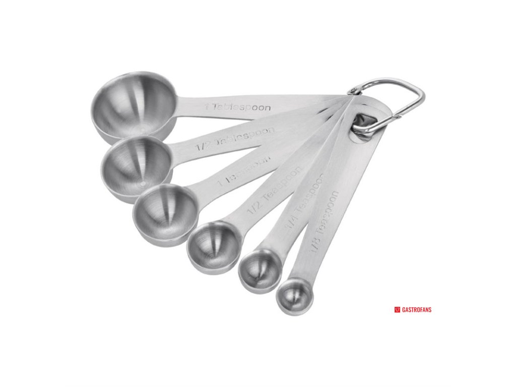 Obsahuje: 1/8 (0,62 ml), 1/4 (1,25 ml), 1/2 (2,5 ml), 1 lyžičku (5 ml) a 1 lyžicu (15 ml). Nerezová oceľ.