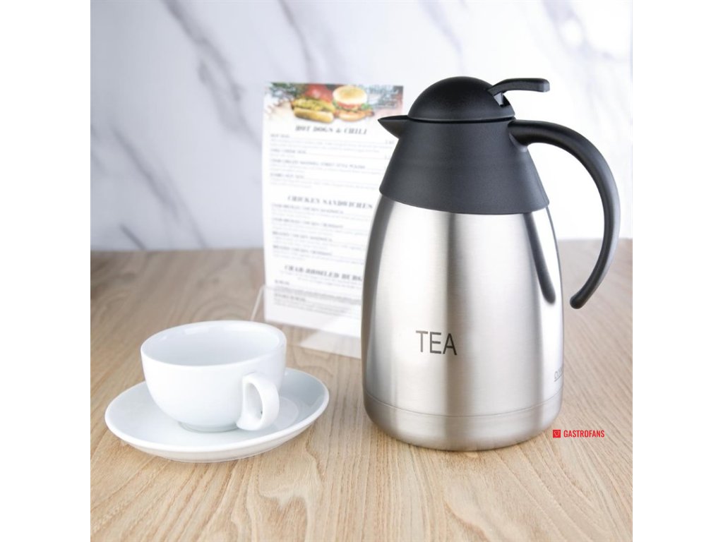 Izolované 1,5 l termokanvice s leptaným nápisom. Dvojplášťové antikorové telo s pákou na palec na riadené dávkovanie. 230(V) x 140(?)mm.Dodatočné parametre