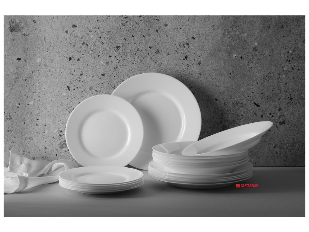 Sada obsahuje: 6 hlbokých dosiek O225 mm, 6 plochých dosiek O245 mm a 6 plochých dosiek O195 mm. Vyrobené z odolného materiálu Opal patentovaného spoločnosťou Arc Medzinárodné Trikrát odolnejšie proti rozbitiu ako porcelán Perfektný povrch aj po 2000 vypraniach vo vybraných umývačky riadu pre catering Priestorovo úsporné stohovanie vybraných produktov