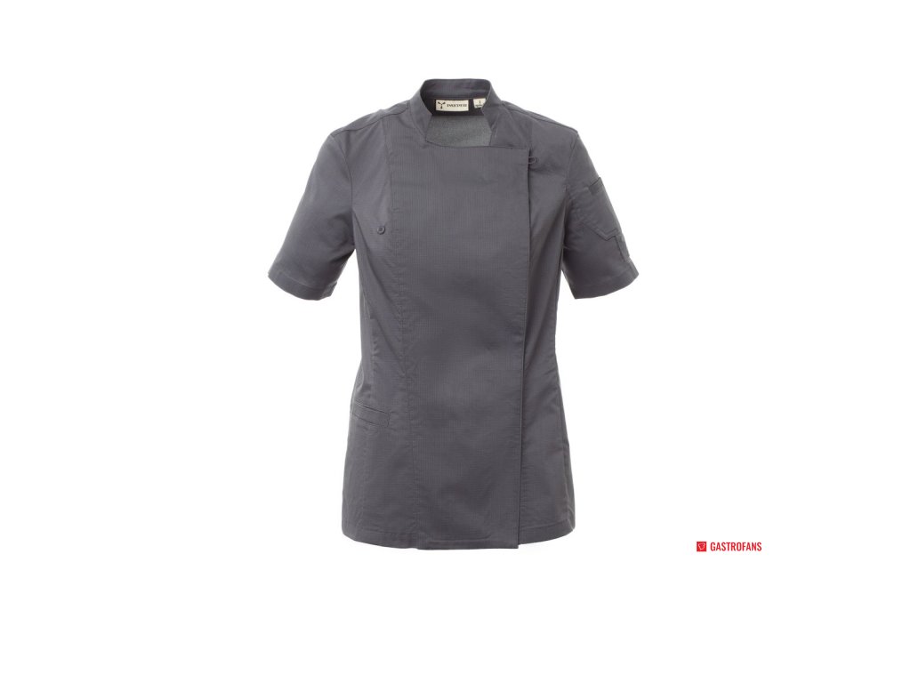 Dámsky kuchársky rondon so stojačikom, z bavlneného ripstopu a Lycry ® T400 ®, s vynikajúcimi elastickými a priedušnými vlastnosťami, s pohodlnou sieťovinou na chrbte pre zvýšenie priedušnosti. Dvojradové zapínanie na patentky, klopa, ktorú je možné preložiť a pripevniť k hrudi pomocou zapínania na nezakrytý gombík, a vytvoriť tak efekt klopy na mieru a inovatívny výstrih do V. Krátke rukávy s lemom. Ikonická tvarovaná nášivka na ľavom ramene, s výšivkou vrtule tón v tóne, doplnená vreckom na pero. Praktické vrecko na smartphone v páse.