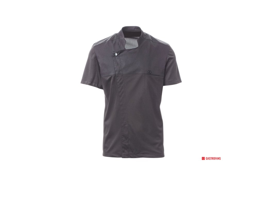 Pánsky kuchársky rondon so stojatým golierom, vyrobená z bavlneného kepru a Lycra® T400®, s vynikajúcimi elastickými a priedušnými vlastnosťami, s pohodlnou sieťovinou na chrbte, rukávoch a páse pre maximálnu priedušnosť. Dvojradové zapínanie na patentky, klopou, ktorú možno preložiť a zapnúť na hrudi pomocou viditeľného gombíka, čím sa vytvorí efekt na mieru šitého klopového goliera a inovatívny výstrih do V. Krátke rukávy s manžetami.Dodatočné parametre