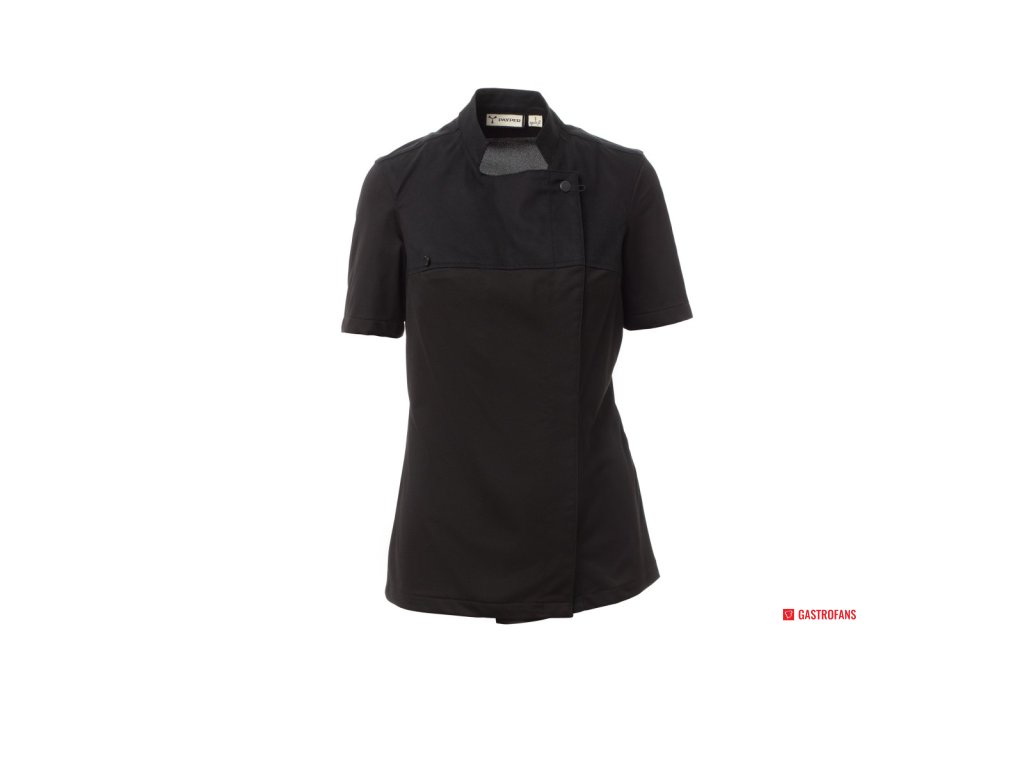 Dámsky kuchársky rondon so stojačikom, z bavlneného kepru a Lycry ® T400 ®, s vynikajúcimi elastickými a priedušnými vlastnosťami, s pohodlnou sieťovinou na chrbte, rukávoch av páse pre maximálne zvýšenie priedušnosti. Dvojradové zapínanie na patentky, klopa, ktorú je možné preložiť a pripevniť k hrudi pomocou zapínania na nezakrytý gombík, a vytvoriť tak efekt klopy na mieru a inovatívny výstrih do V. Krátke rukávy s lemom.