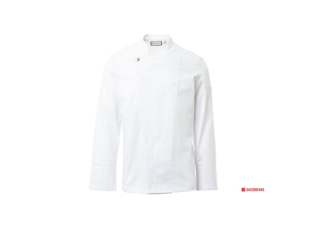 Pánsky kuchársky rondon so stojatým golierom, vyrobená z bavlneného kepru a Lycra® T400®, s vynikajúcimi elastickými a priedušnými vlastnosťami. Dvojradové zapínanie na patentky, klopou, ktorú možno preložiť a zapnúť na hrudi pomocou viditeľného gombíka, čím vzniká efekt na mieru šitého klopu a inovatívny výstrih do V. Dlhé rukávy s vyhrnutými manžetami, sieťovaný klin pod pazuchami pre zvýšenú priedušnosť. Ikona v tvare nášivky na ľavom ramene s výšivkou vrtule v rovnakom odtieni, doplnená vreckom na pero. Praktické vrecko na smartfón v páse. Zvislé rozparky v dolnej časti chrbta pre ľahší pohyb.Dodatočné parametre