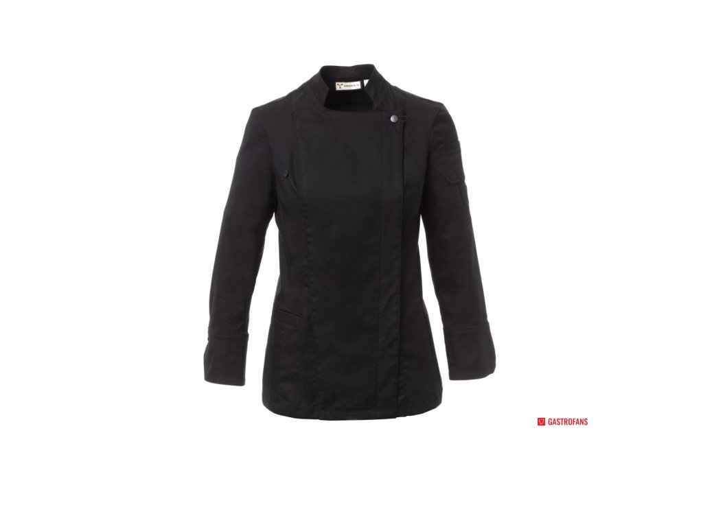 Dámsky kuchársky rondon so stojatým golierom, vyrobená z bavlneného kepru a Lycra® T400®, s vynikajúcimi elastickými a priedušnými vlastnosťami. Dvojradové zapínanie na patentky, klopou, ktorú možno preložiť a zapnúť na hrudi pomocou viditeľného gombíka, čím vzniká efekt na mieru šitého klopu a inovatívny výstrih do V. Dlhé rukávy s manžetami zapínanými na viditeľné patentky. Ikona v tvare nášivky na ľavom ramene s výšivkou vrtule v rovnakom odtieni, doplnená vreckom na pero. Praktické vrecko na smartfón v páse. Zvislé rozparky v spodnej časti chrbta pre ľahký pohyb.Dodatočné parametre