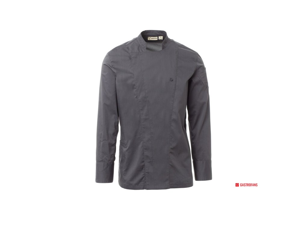 Dámsky kuchársky rondon so stojatým golierom, vyrobená z bavlny ripstop a Lycra® T400®, s vynikajúcimi elastickými a priedušnými vlastnosťami, s pohodlnou sieťovinou na chrbte pre zvýšenú priedušnosť. Dvojradové zapínanie na patentky, klopou, ktorú možno preložiť a zapnúť na hrudi pomocou viditeľného gombíka, čím sa vytvorí efekt na mieru šitého klopu a inovatívny výstrih do V. Krátke rukávy s manžetami. Ikona v tvare nášivky na ľavom ramene s výšivkou vrtule v rovnakom odtieni, doplnená vreckom na pero. Praktické vrecko na smartfón v páse.Dodatočné parametre