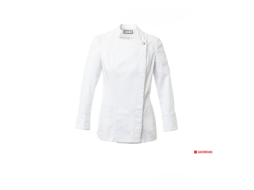 Dámsky kuchársky rondon so stojatým golierom, vyrobená z bavlneného kepru a Lycra® T400®, s vynikajúcimi elastickými a priedušnými vlastnosťami. Dvojradové zapínanie na patentky, klopou, ktorú možno preložiť a zapnúť na hrudi pomocou viditeľného gombíka, čím vzniká efekt na mieru šitého klopu a inovatívny výstrih do V. Dlhé rukávy s manžetami zapínanými na viditeľné patentky. Ikona v tvare nášivky na ľavom ramene s výšivkou vrtule v rovnakom odtieni, doplnená vreckom na pero. Praktické vrecko na smartfón v páse. Zvislé rozparky v spodnej časti chrbta pre ľahký pohyb.Dodatočné parametre