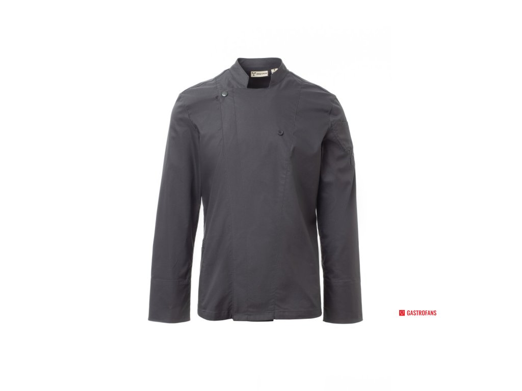 Pánsky kuchársky rondon so stojatým golierom, vyrobená z bavlneného kepru a Lycra® T400®, s vynikajúcimi elastickými a priedušnými vlastnosťami. Dvojradové zapínanie na patentky, klopou, ktorú možno preložiť a zapnúť na hrudi pomocou viditeľného gombíka, čím sa vytvorí efekt na mieru šitého klopu a inovatívny výstrih do V. Dlhé rukávy s vyhrnutými manžetami, sieťovaný klin pod pazuchami pre zvýšenú priedušnosť. Ikona v tvare nášivky na ľavom ramene s výšivkou vrtule v rovnakom odtieni, doplnená vreckom na pero. Praktické vrecko na smartfón v páse. Zvislé rozparky v spodnej časti chrbta pre ľahký pohyb.Dodatočné parametre