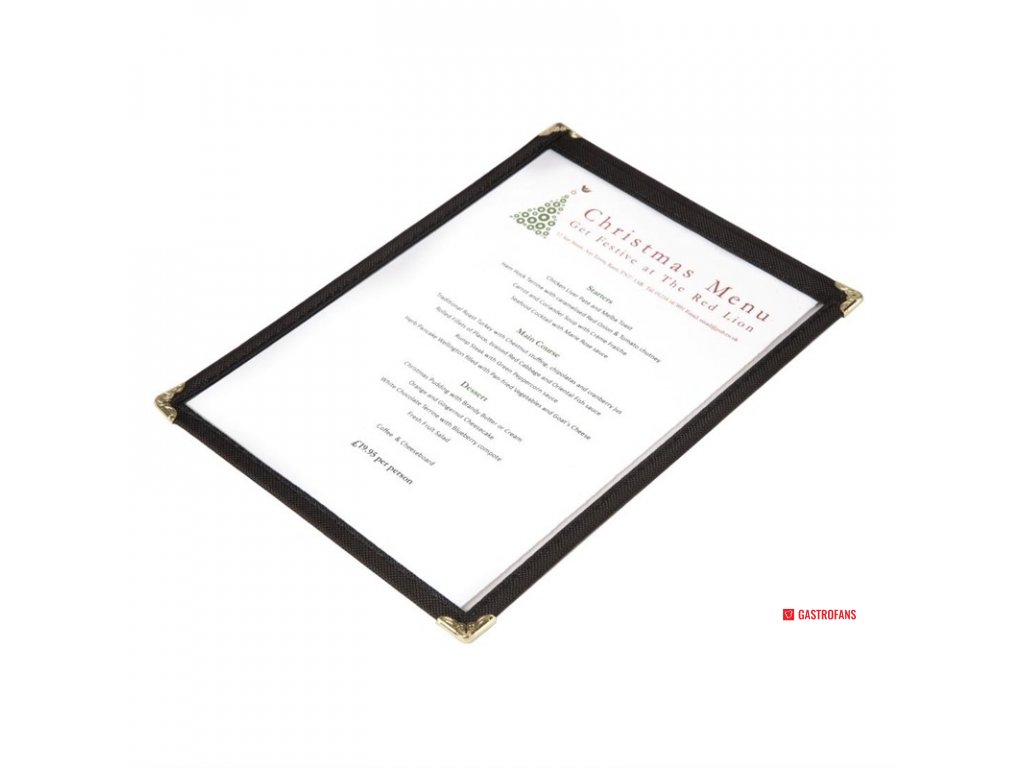 Pre elegantnú, praktickú a profesionálnu prezentáciu jednoducho zasuňte jedálny lístok za číry otierateľný plast. Okraje z atraktívneho materiálu a kovové rohy pre zvýšenú odolnosť. K dispozícii vo formátoch A4 a A5 s dvoma alebo štyrmi stránkami. Ponukové karty nie sú v cene.Dodatočné parametre